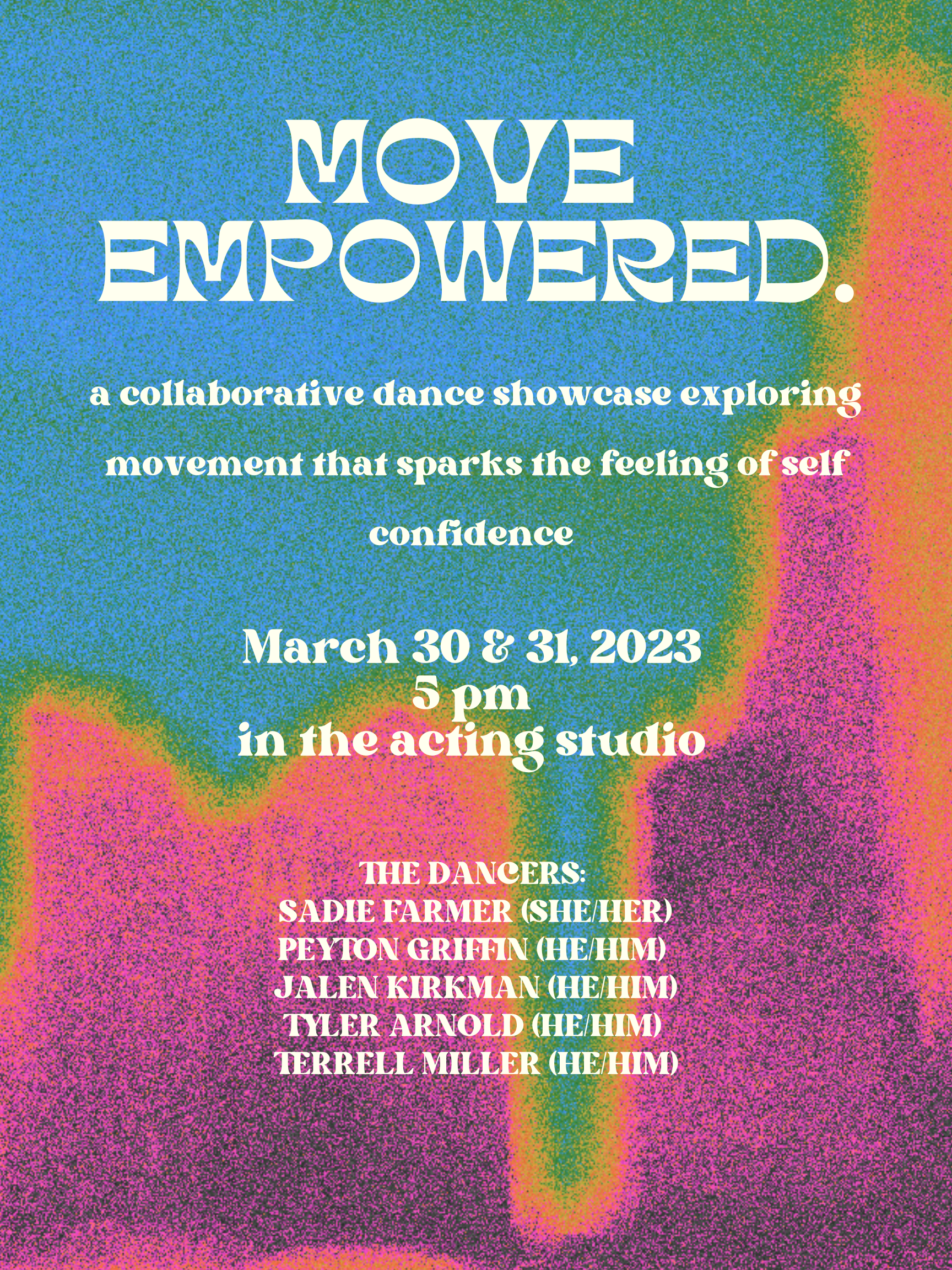 For my senior honor’s project, I created a dance showcase entitled “Move Empowered” in order to showcase how dance can be an outlet for finding self-confidence and empowerment within your body. As someone who has had a difficult relationship with my body image and dance, I am so passionate about this project because it encompasses how far I have come in being able to dance for joy and fun rather than criticizing my dance abilities and blaming my body type for what I can’t do. Throughout college, I’ve discovered my love for dance and that absolutely everyone deserves to dance no matter their technical abilities or what their body looks like. Each member of the cast choreographed a dance to a song that makes them feel empowered and shares a bit about why dance empowers them in order to inspire audience members to feel empowerment through movement.